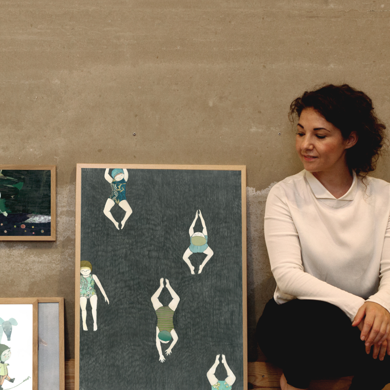 Kirstine Falk er en del af Højkants faste designere. I sit værksted i baglokalerne frembringer hun sit underfundige billedunivers, som spænder fra store, unikke malerier og til prints i mindre oplag.